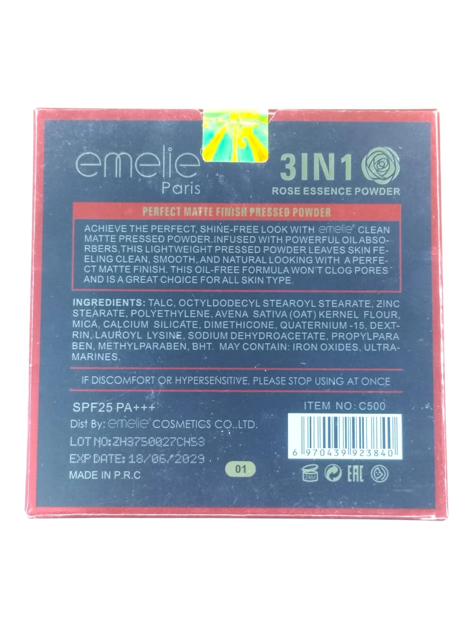 Experience the freshness of roses with emelie Paris 3 IN 1 Perfect Touch Matte Effect Powder. Infused with Rose Essence, this pressed powder leaves your skin feeling clean, smooth, and naturally radiant. It features a powerful oil-absorbing formula that delivers a perfect shine-free matte finish. With added SPF 25 PA+++, it protects your skin from harmful sun rays while ensuring your pores stay unclogged. Ideal for all skin types, this "Clean Matte" powder gives you a flawless look instantly.